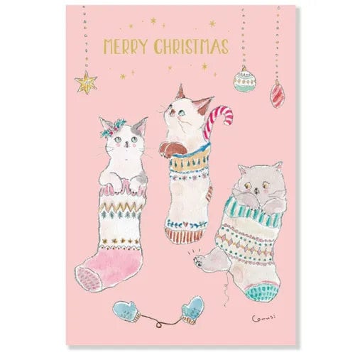 おめかししたにゃんこ達がクリスマスを楽しくしてくれる、贈るのはもちろんコレクションにもおススメな、金箔を施した華やかなポストカードです。
