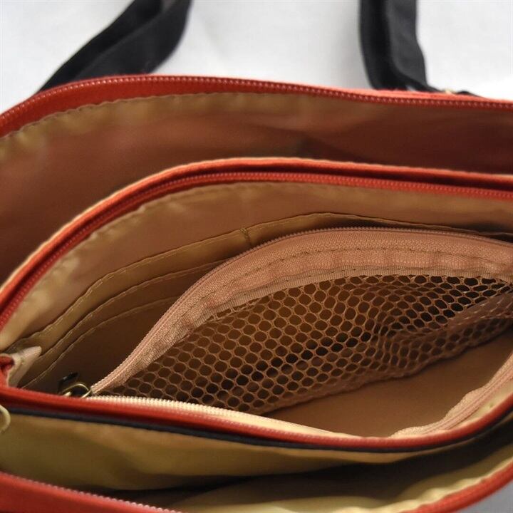 アンティークゴールドが渋く光るファスナーをあけると、中は大きく5室に仕切られています。