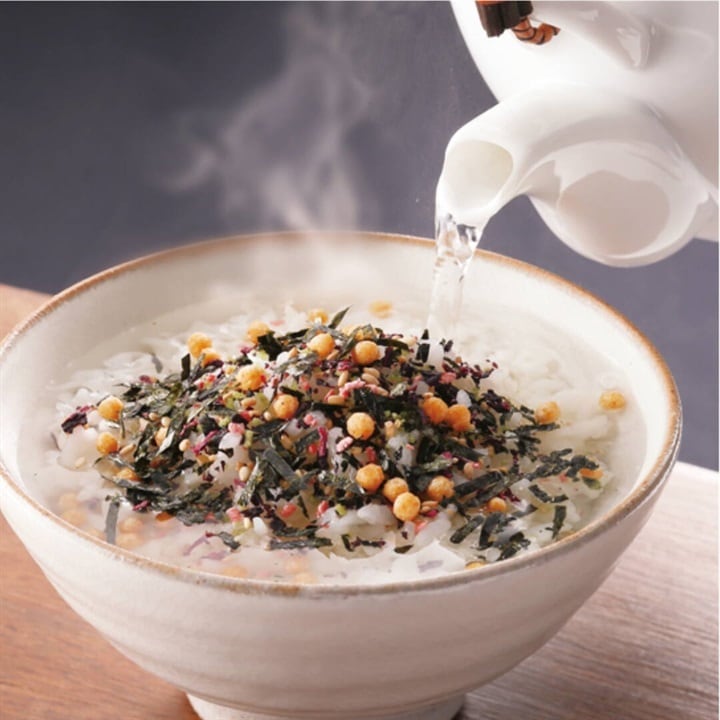 ・さけ茶漬け:食塩(国内製造)、あられ、味付さけフレーク(さけ、食塩、砂糖、乳糖)、砂糖、味付わかめ(わかめ、砂糖、食塩、魚介エキス)、のり、乳糖、しょうゆ、かつお節粉末、コーンスターチ、抹茶、小麦粉、魚介エキス調味料、昆布粉、酵母エキス/調味料(アミノ酸等)、酸化防止剤(ビタミンE)、ベニコウジ色素、(一部に乳成分・小麦・さけ・大豆を含む)