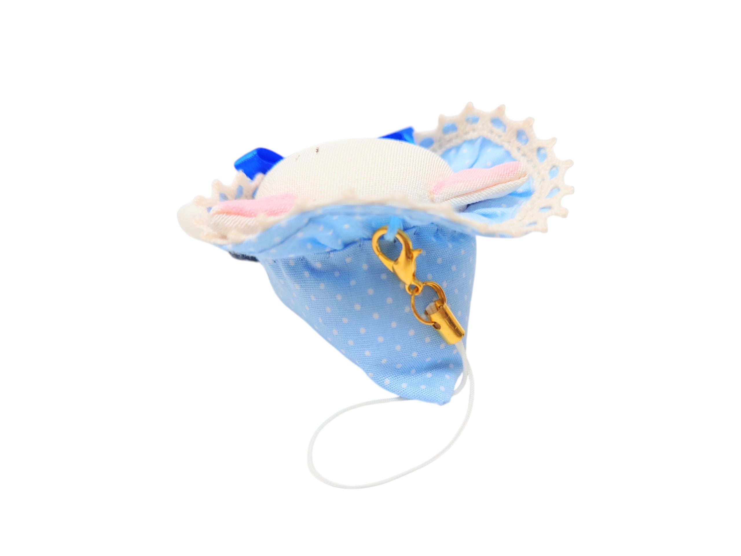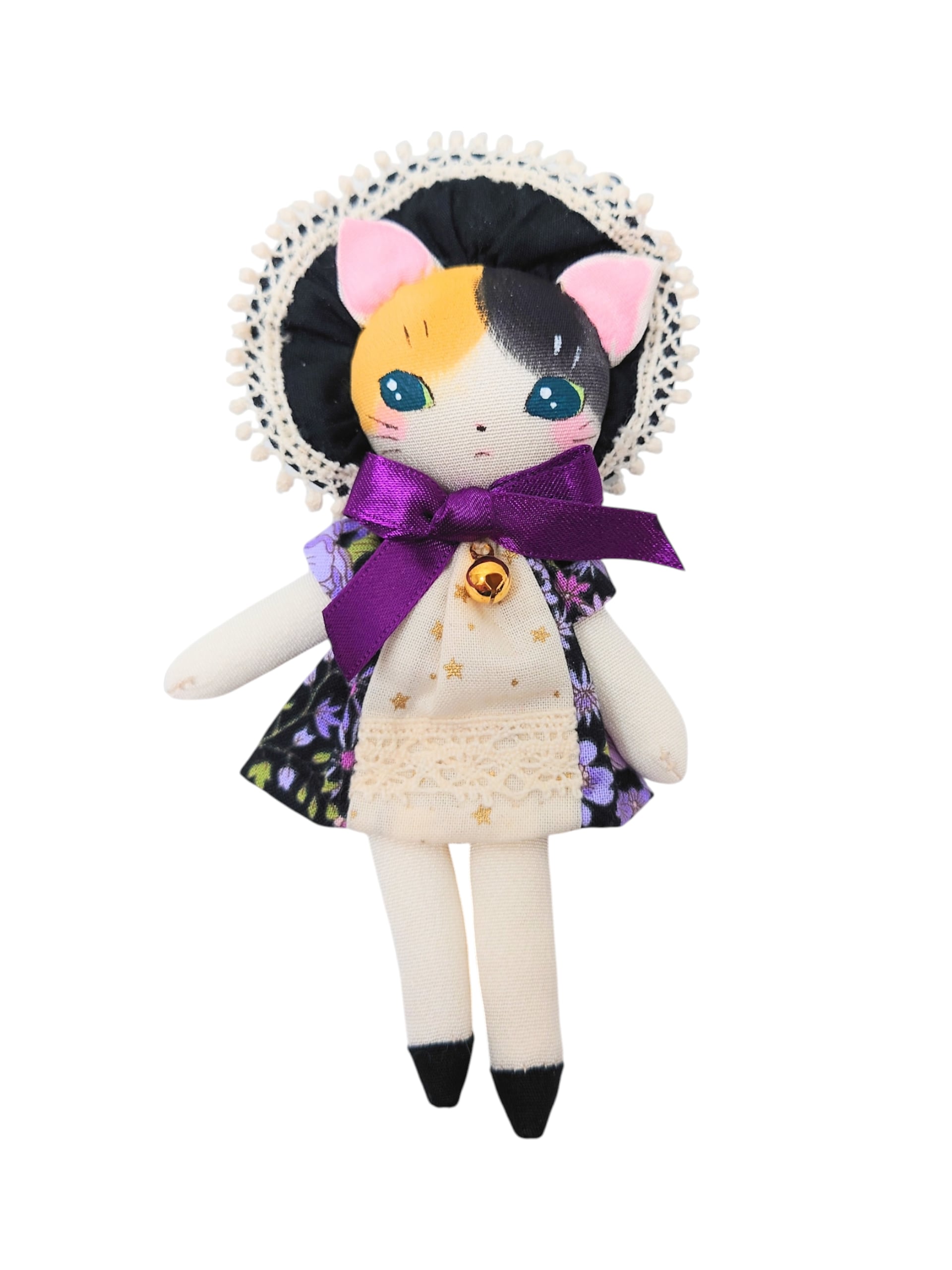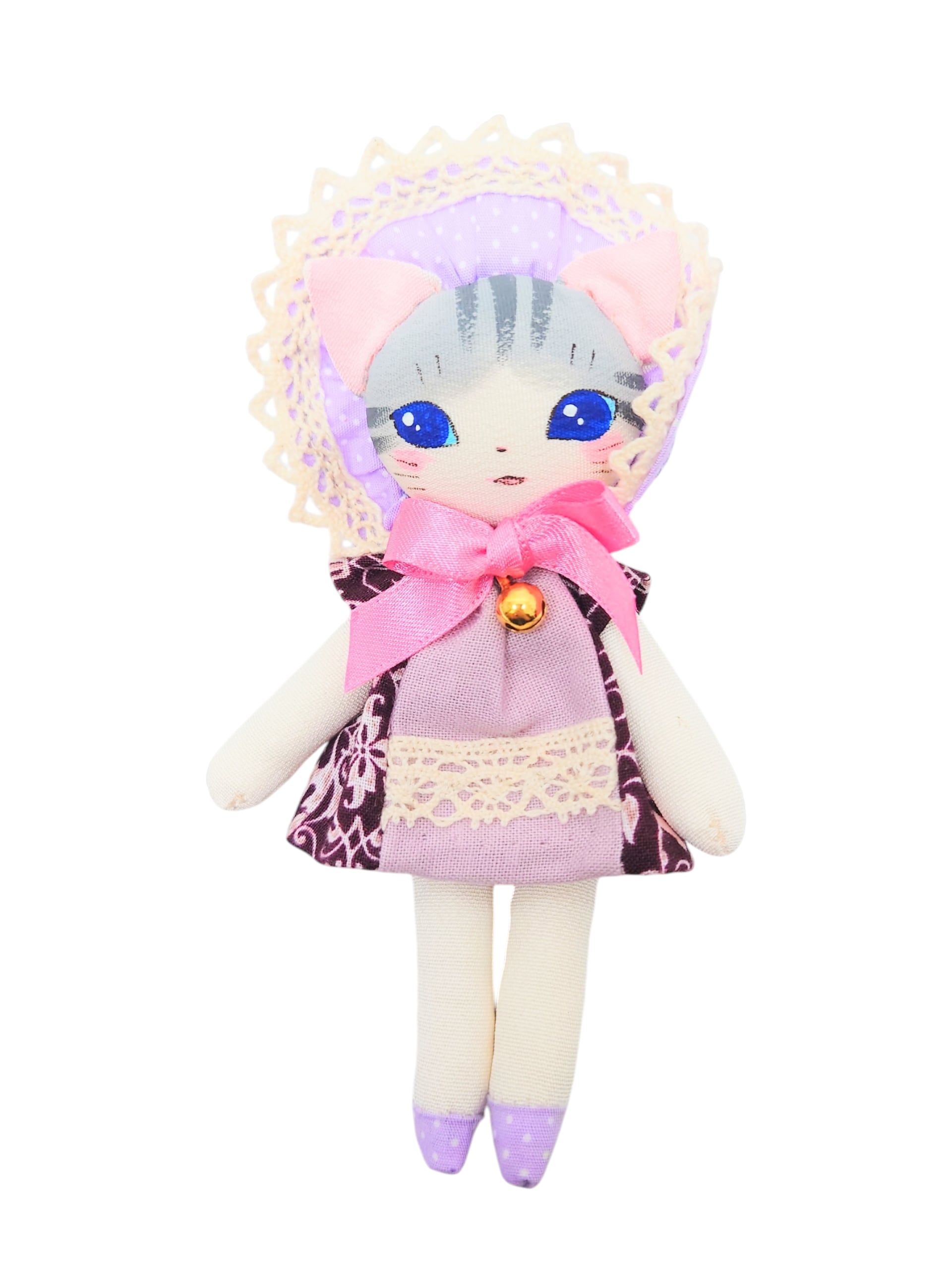 このハンドメイド作品は、愛らしいお洋服を着た猫のマスコットで、柔らかな雰囲気が感じられる一点ものです。手作りで仕上げられており、どこかほっこりするデザインが魅力です。