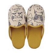 ナチュラルな風合いが魅力の綿麻生地に、大きな手書き風のねこの顔をプリントしたスリッパです。