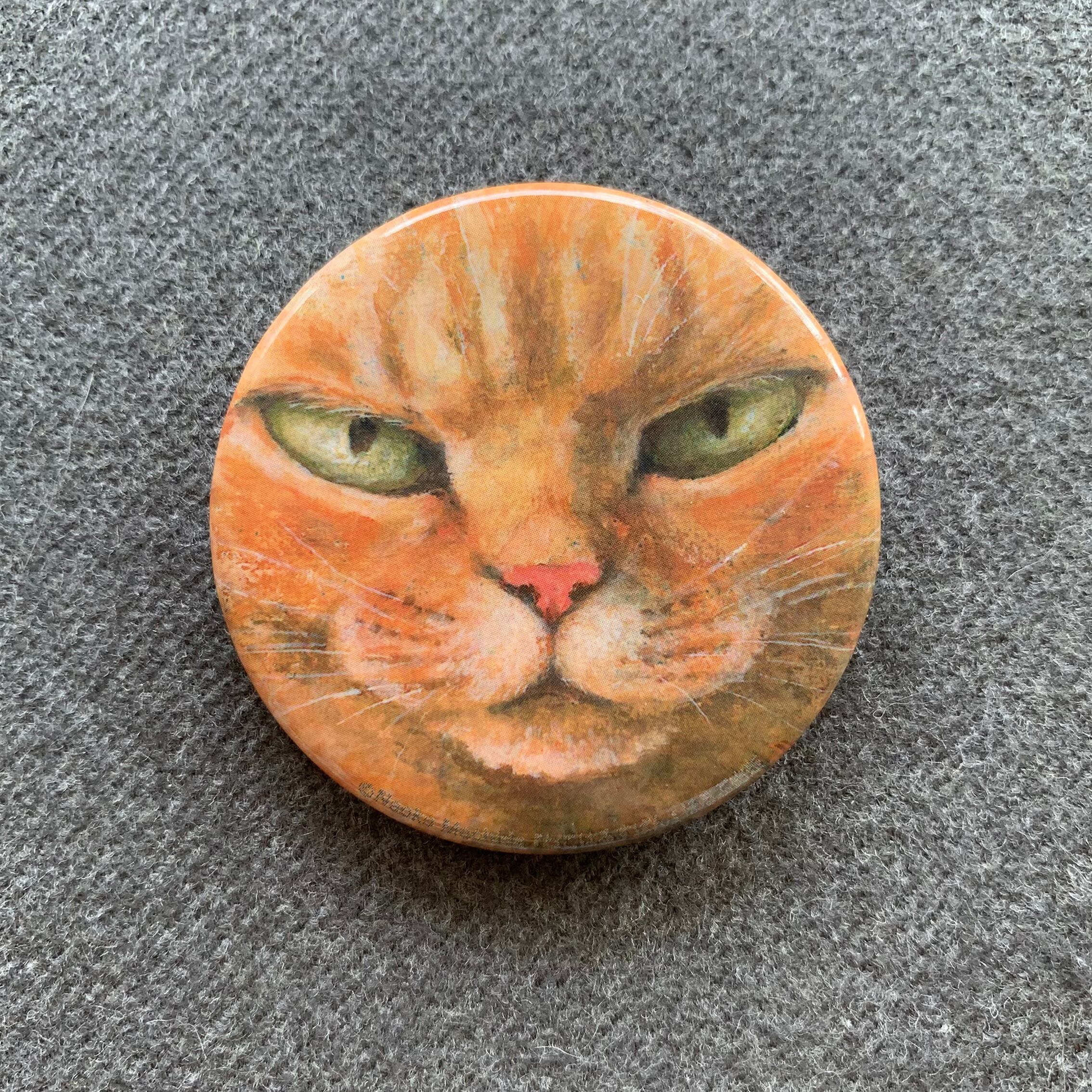 「ねこはるすばん」の三毛猫の顔アップの缶バッジです。