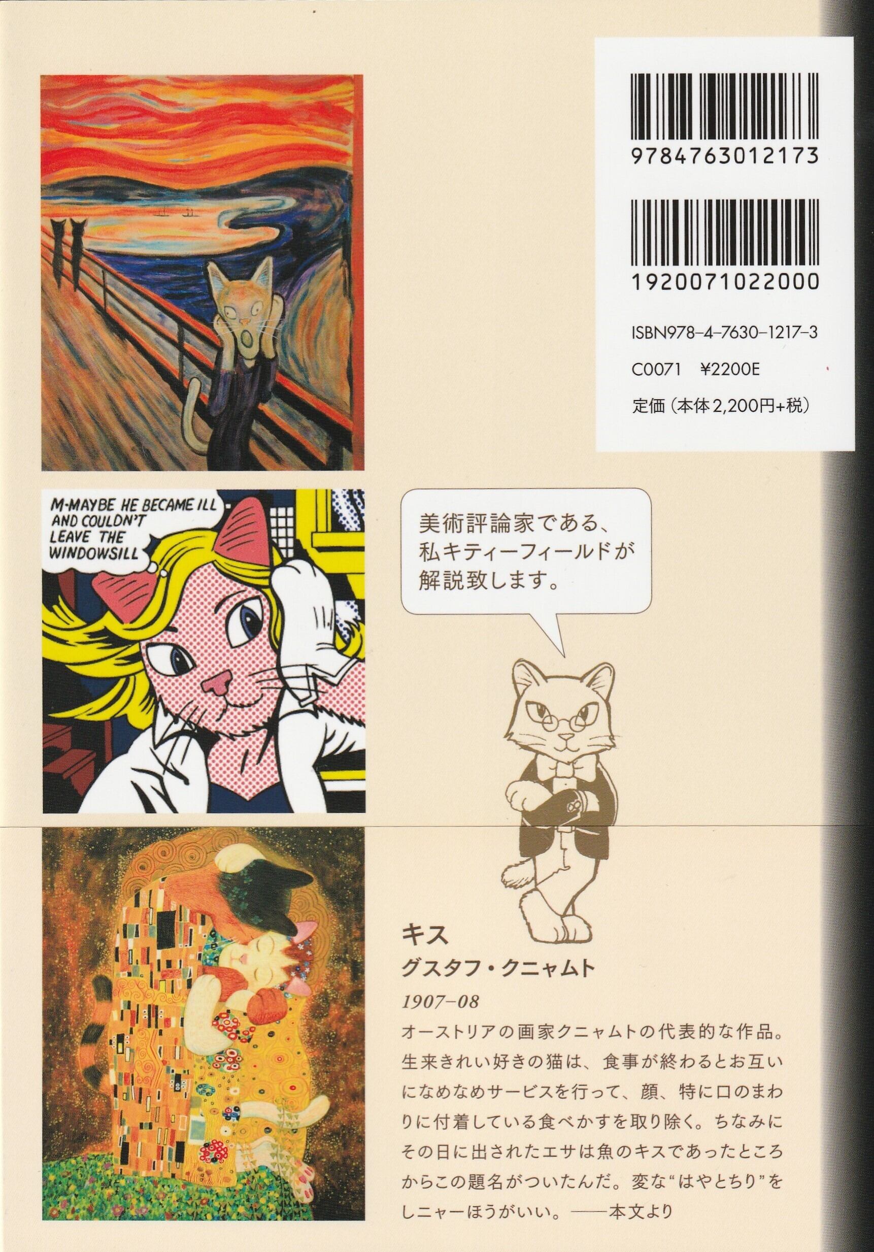 作品タイトル、作家名も、猫語に変換。作品解説は、キティーフィールドという猫の美術評論家による、猫美術界の解説。